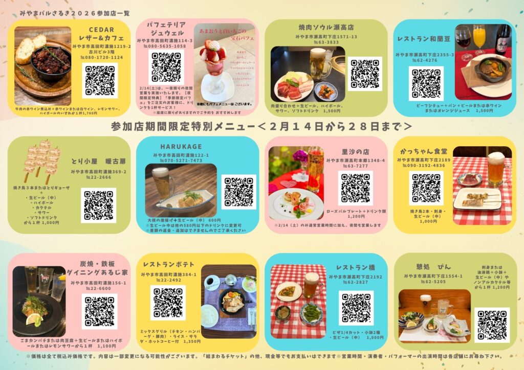 2/14(土)よりみやまバルさるきを開催します! 初日は各参加店にて楽器演奏やライブのイベントを行います。また、2/28(土)までの期間中、バル特別メニューの提供がございますのでぜひお越しください。 ※結いまわるチケットやスタンプラリー特典電子チケットが使用できます